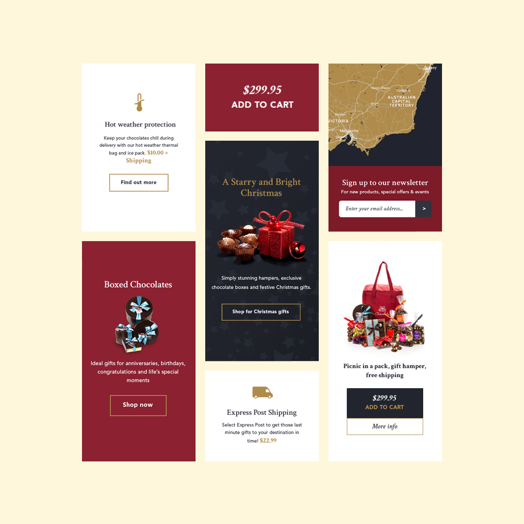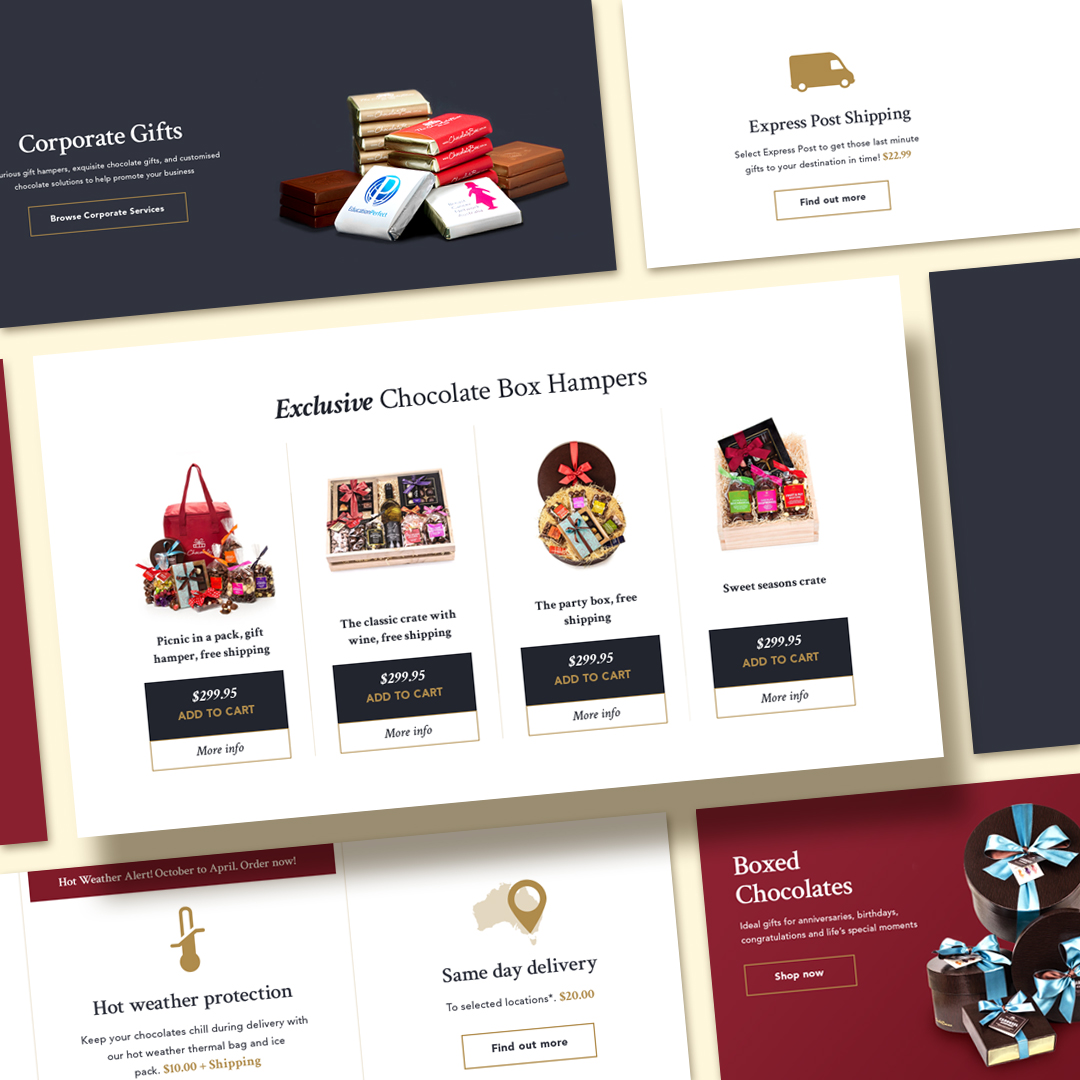 With a legacy dating back to 1958 and multiple retail locations—including Melbourne CBD, Camberwell, Port Melbourne, Melbourne Airport, Royal Women’s Hospital, and Sydney Domestic Airport—The Chocolate Box needed a refreshed digital presence. The goal was to create a responsive user interface that appealed to both retail and corporate customers, while elegantly showcasing their seasonal chocolate collections for occasions such as Mother’s Day, Father’s Day, Easter, Christmas, and more.